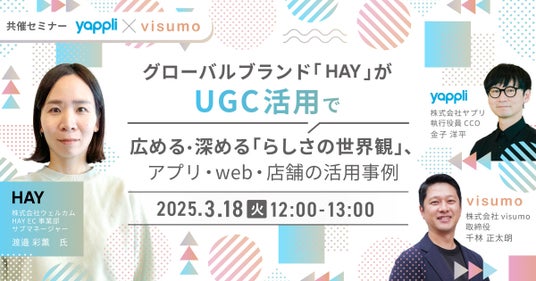 アプリプラットフォーム「Yappli(ヤプリ)」を提供する株式会社ヤプリ(本社:東京都港区、代表取締役:庵原保文、以下「ヤプリ」)は、株式会社visumo(本社:東京都渋谷区、代表取締役社長:井上 純、以下「visumo」) が運営するビジュアルマーケティングプラットフォーム「visumo(ビジュモ)」のUGC(※)活用機能「visumo social」と連携し、株式会社ウェルカム(本社:東京都港区、代表取締役 横川正紀)が運営する、「HAY公式アプリ」のUGC活用支援を開始したことをお知らせいたします。