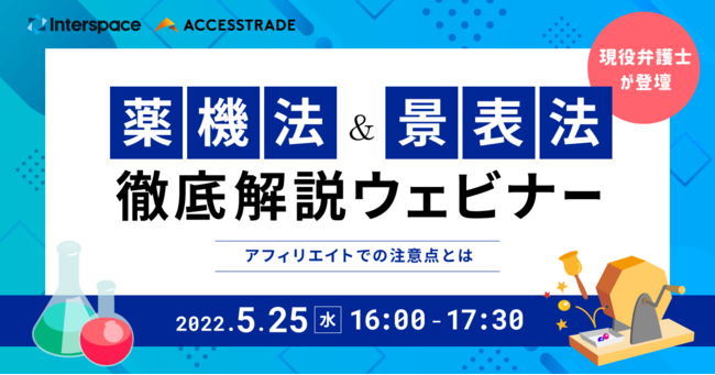 インターネット広告・メディア運営事業の株式会社インタースペース(所在地:東京都新宿区、代表取締役社長:河端伸一郎、証券コード:2122、以下インタースペース)の運営するアフィリエイトサービス「アクセストレード」は、一般社団法人薬機法医療法規格協会/全国薬機法医療法弁護士協会と、アフィリエイター向けに薬機法&景表法を徹底解説する無料ウェビナーを2022年5月25日(水)に共同で開催いたします。