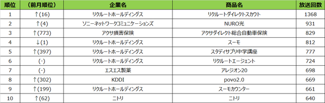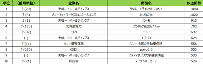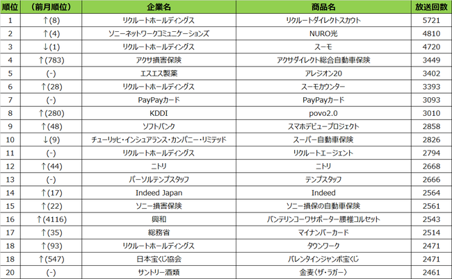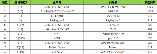 2022年2月度の概要2021年2月度の商品別ランキングは、1位はリクルートホールディングス「リクルートダイレクトスカウト」、2位ソニーネットワークコミュニケーションズ「NURO光」、3位リクルートホールディングス「スーモ」という結果となりました。