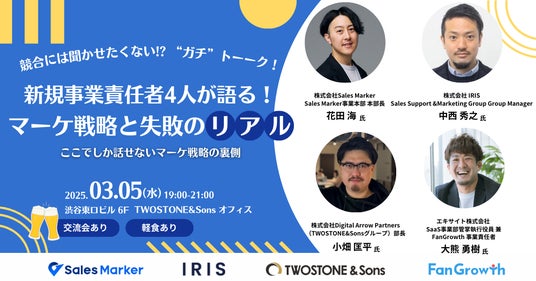 株式会社TWOSTONE&Sons(所在地:東京都渋谷区、代表取締役CEO:河端保志、代表取締役COO:高原克弥、証券コード:7352、以下TWOSTONE&Sons)は、2025年3月5日(水)に、株式会社Sales Marker、株式会社 IRIS、エキサイト株式会社との4社共催で、「マーケティング戦略と失敗談を語る」トークイベントを開催いたします。