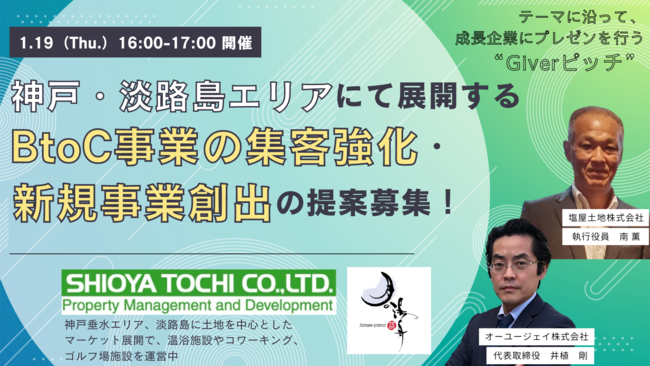 審査制・決裁者マッチングプラットフォーム「ONLY STORY」「チラCEO」(サービスサイト:https://onlystory.co.jp/service/ )を運営する株式会社オンリーストーリー(代表取締役:平野哲也、本社:東京都渋谷区)は、1月19日(木)に塩屋土地株式会社とオーユージェイ株式会社を招き、ビジネスマッチングを目的としたオンラインイベント「ギバーピッチ」を開催します。参加者は両社に対して、新たな集客施策と新規事業創出に関する提案を行います。
