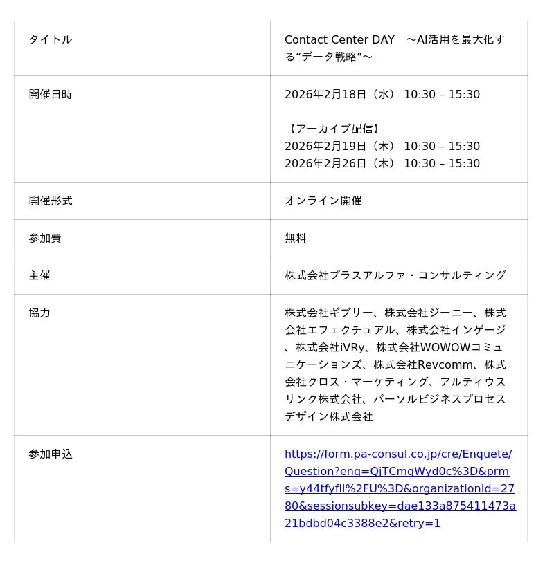 コミュニケーションプラットフォーム「Re:lation(リレーション)」を提供し、6,000社以上(※1)の導入実績を誇る株式会社インゲージ(本社:大阪府大阪市、代表取締役社長:和田 哲也)は、2026年2月18日(水)に株式会社プラスアルファ・コンサルティングが主催するウェビナー「Contact Center Day ~AI活用を最大化する“データ戦略”~」に登壇することをお知らせいたします。