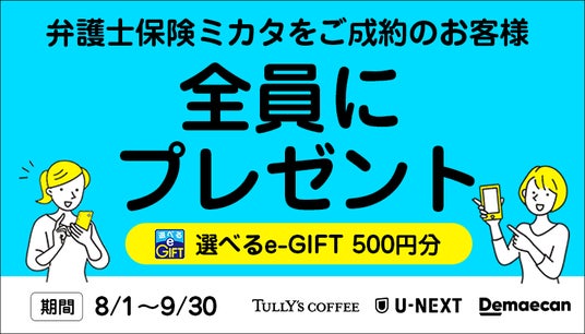 対象期間中に弁護士保険STATION経由で、ミカタ少額短期保険株式会社「弁護士保険ミカタ」の契約申込を完了し、ご契約が成立されたお客様全員に「選べるe-GIFT 500円分」をプレゼントします。