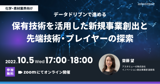 アスタミューゼ株式会社(本社:東京都千代田区、代表取締役社長 永井歩)は、「データドリブンで進める保有技術を活用した新規事業創出/先端技術・プレイヤーの探索~化学・素材業界向け~」と題し、無料ウェビナーを開催いたします。