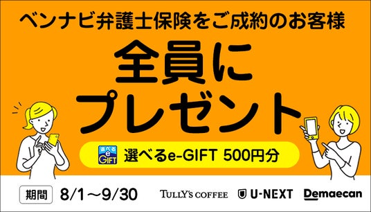 ■キャンペーン内容https://bengoshi-h.info/campaign_bennavi/対象期間中に弁護士保険STATION経由で、株式会社アシロ少額短期保険「ベンナビ弁護士保険」の契約申込を完了し、ご契約が成立されたお客様全員に「選べるe-GIFT 500円分」をプレゼントします。