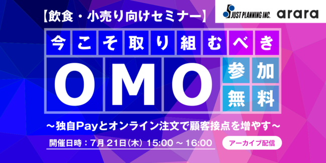 アララ株式会社(本社:東京都港区、代表取締役社長:尾上 徹、証券コード:4015、以下「アララ」)は、株式会社ジャストプランニング(本社:東京都大田区、代表取締役社長:酒井 敬、以下「ジャストプランニング」)と共に6月28日(火)に開催し、好評を博した飲食・小売り向けセミナー「今こそ取り組むべきOMO~独自Payとオンライン注文で顧客接点を増やす~」のアーカイブ配信を2022年7月21日(木)に実施いたします。