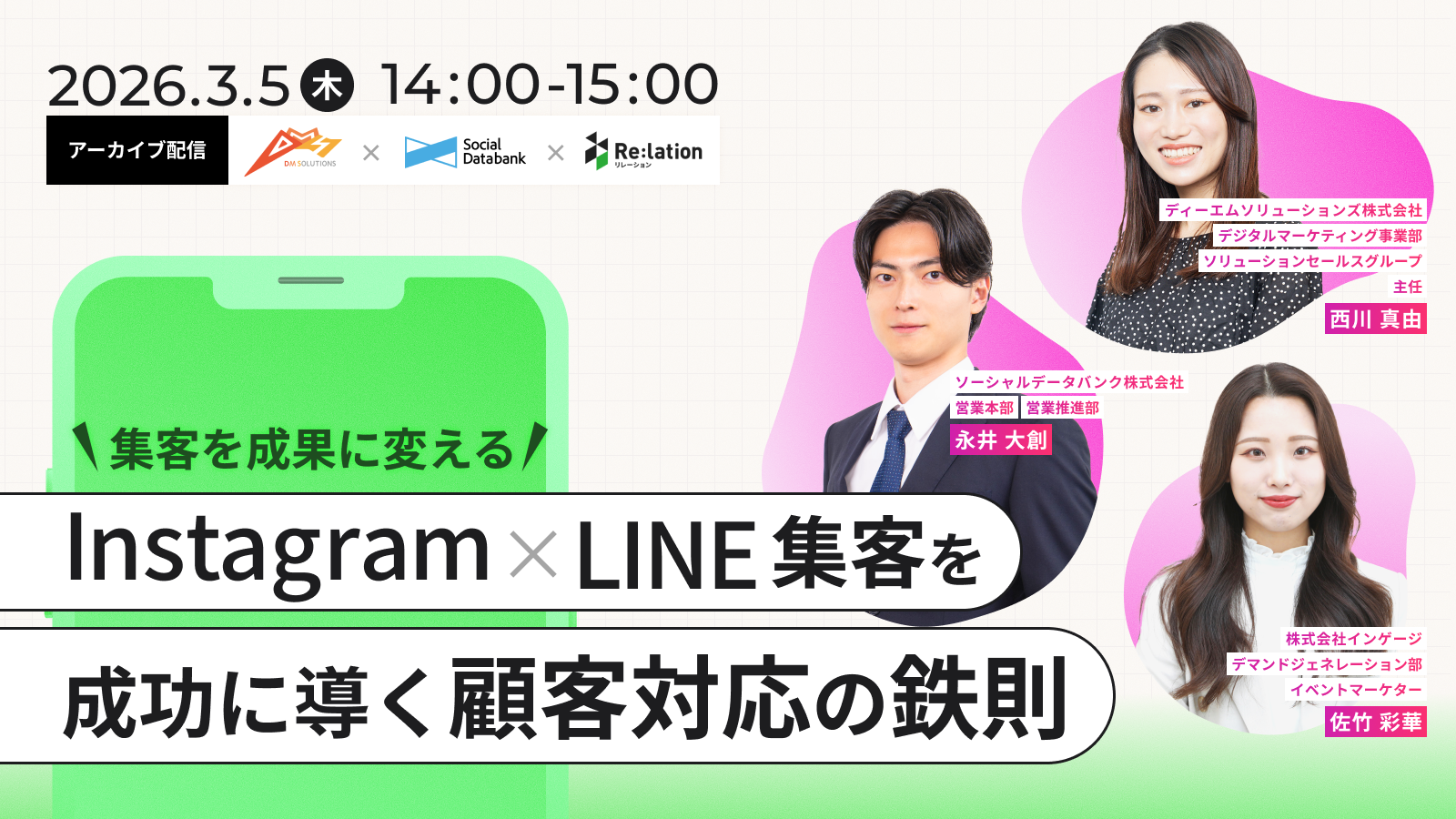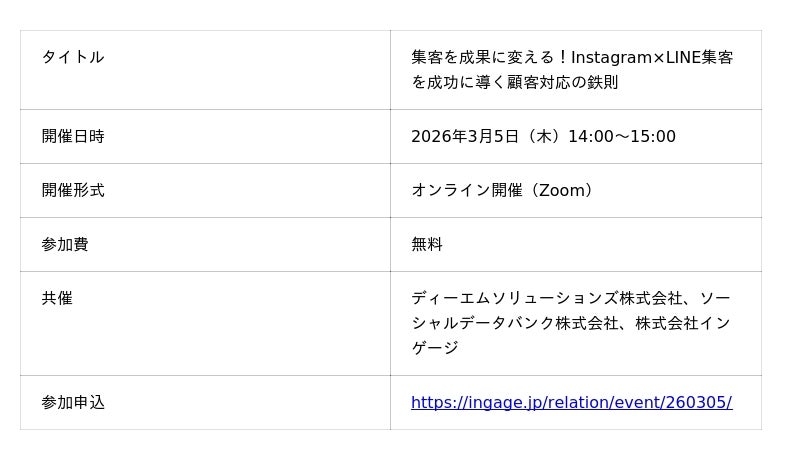 コミュニケーションプラットフォーム「Re:lation(リレーション)」を提供し、6,000社以上(※1)の導入実績を誇る株式会社インゲージ(本社:大阪府大阪市、代表取締役社長:和田 哲也)は、2026年3月5日(木)に、ディーエムソリューションズ株式会社、ソーシャルデータバンク株式会社との3社共催によるウェビナー「集客を成果に変える!Instagram×LINE集客を成功に導く顧客対応の鉄則」をアーカイブ配信することをお知らせいたします。