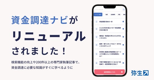 弥生株式会社(本社:東京都千代田区、代表取締役 社長執行役員:前山 貴弘、以下「弥生」)は、提供する「資金調達ナビ」を大幅リニューアルしたことをお知らせします。フリーワードおよびタグによる検索機能を追加したことで、200件以上の記事コンテンツの中から初めての資金調達に必要な知識へ簡単に、素早くアクセスできるようになりました。