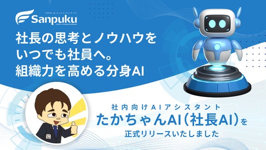 株式会社三福ホールディングス(所在地:愛媛県松山市、代表取締役:中矢孝則)は、2025年11月、社内向けAIアシスタント「たかちゃんAI(社長AI)」を正式リリースいたしました。本サービスは、代表・中矢が日々考えている経営判断の背景や、営業ノウハウ、顧客対応の方針などを学習させた“社長の分身AI”として、全社員が24時間いつでも活用できる社内専用ツールです。