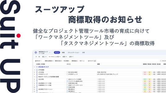 スーツ「経営支援クラウド」、「Suit UP」、「全社タスク管理」及び「全社プロジェクト管理」に続き、「ワークマネジメントツール」及び「タスクマネジメントツール」の商標を取得