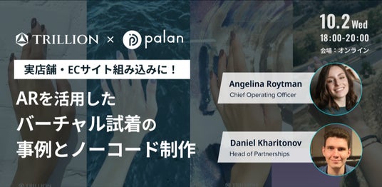WebARサービスを提供する株式会社palan (本社:東京都渋谷区、代表取締役:齋藤 瑛史)は、Trillion Technology LCC(イギリス)と、10/02 (水)18:00~に共催セミナー「実店舗・ECサイト組み込みに!ARを活用したバーチャル試着の事例とノーコード制作」を開催いたします。