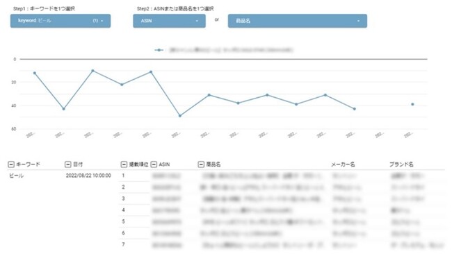 Amazonにおける特定カテゴリに対する売上ランキング推移を可視化し、自社商品の立ち位置とターゲットとなる競合商品を把握します。ランキング上位を占めるブランドや商品の特徴を分析し、広告運用でのターゲティングや商品ページの改修などに活用することが可能です。