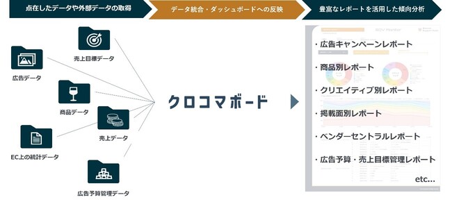このたび、デジタル・アドバタイジング・コンソーシアム株式会社(本社:東京都渋谷区、代表取締役社長 執行役員CEO兼CCO:田中雄三、以下 DAC)のコマースDX横断対応組織「CROSS COMMERCE Studio」は、ECモールでの物販事業を展開する企業向けに、ECモールのデータを収集・統合・管理し、ECマーケティングにおける意思決定を多角的に支援する分析ダッシュボード「クロコマボード」の提供を開始いたします。本サービスは、博報堂DYグループのEC領域に特化した組織横断型プロジェクト「HAKUHODO EC+」の取り組みの一環です。