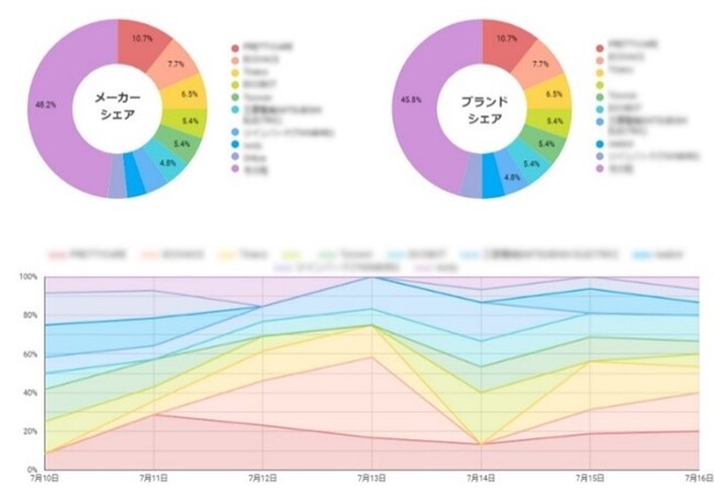 Amazon、楽天市場、Yahoo!ショッピングの3大ECモールでの検索結果ページにおける自社・競合商品のSOV(Share of voice:広告出稿量・メディア露出量のシェア)を可視化します。広告枠による掲載も日別で把握できるため、競合商品がどの時期に入札を強化しているのか等の分析が可能です。