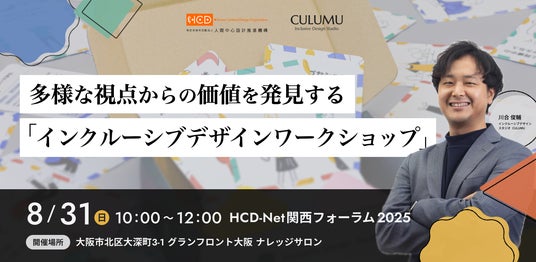 株式会社STYZ(本社:東京都渋谷区、代表取締役社長:田中辰也)が運営するインクルーシブデザインスタジオ CULUMU は、2025年8月31日(に)に大阪で開催される有料イベント「HCD-Net関西フォーラム2025」に、事業部責任者の川合俊輔が登壇することをお知らせいたします。本フォーラムでは、インクルーシブデザインワークショップを実践形式で実施し、“当事者視点”と“多角的な視点”から課題を発見し、新たな価値を創出する手法を解説します。