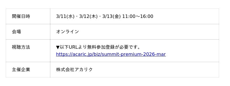 ▶とりあえず申し込む(無料)【直近開催予定】Acaric Summit Premium 人事・採用EXPO|3/11(水)・3/12(木)・3/13(金)開催