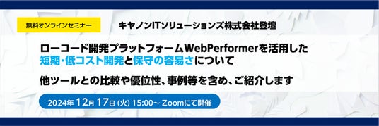 株式会社ニーズウェル(本社:東京都千代田区、代表取締役社長 船津浩三)は、2024年12月17日(火)15時より、キヤノンITソリューションズ株式会社登壇・無料オンラインセミナー「ローコード開発プラットフォームWebPerformerを活用した短期・低コスト開発と保守の容易さについて、他ツールとの比較や優位性、事例等を含め、ご紹介します」を開催します。