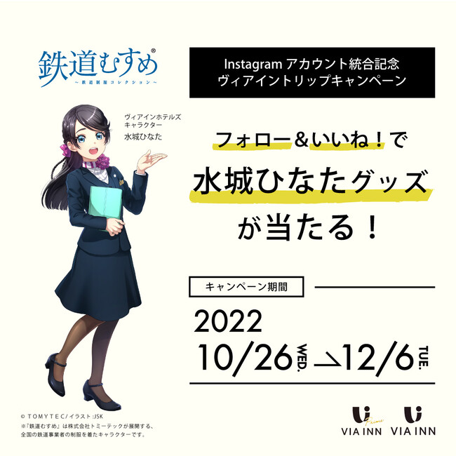 鉄道むすめ「水城ひなた」はJR西日本ヴィアインホテルズのキャラクターとして2022年9月20日にデビューしました。JR西日本ヴィアインの公式Instagramアカウントにも登場します!今後の活躍にご期待ください。