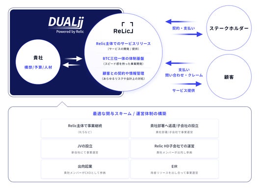 上記のような大企業が抱えている問題を解決するためのソリューションとして、RelicではDUALiiを提供しています。DUALiiでは、仮説検証を経て本格的に事業化するために、Relicが運営主体となり事業をスタートさせ、組織設計やファイナンスの面においても、事業フェーズや事業内容に応じた柔軟かつ最適なスキーム・運営体制を構築できます。