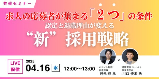 ホワイト企業認定を展開する一般財団法人 日本次世代企業普及機構(本部:大阪市北区、代表理事:岩元翔)は、株式会社フォロアス 事業責任者 川口優孝氏を迎え、ホワイト財団代表理事 岩元翔が「求人の応募者が集まる「2つ」の条件 認定と退職理由が変える【"新"採用戦略】」についてのウェビナーを開催します。