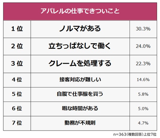 アパレルの仕事をしたことがある363人に「アパレルの仕事できついこと」を聞いたところ、1位は「ノルマがある(30.3%)」でした。2位「立ちっぱなしで働く(24.0%)」、3位「クレームを処理する(22.3%)」が続きます。