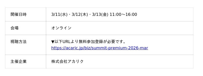 ▶とりあえず申し込む(無料)【開催中】Acaric Summit Premium 人事・採用EXPO|3/11(水)・3/12(木)・3/13(金)開催