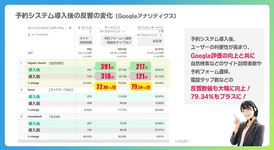 検索結果の表示回数が増加することで、ホームページの反響数値も伸張いたしました。アクセス数は、Google検索などの自然検索経由での訪問件数が318件だったところ、導入後には391件と22.96%増となり、予約フォームへ遷移した数や電話番号をタップした数などの反響数は、121件から217件へと79.34%増と集客拡大に大きく貢献いたしました。