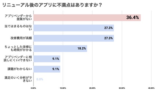 ただし2割弱のユーザーがリニューアル後も不満を感じている点は注目すべきポイントであり、リニューアル後のアプリに対する不満点についても同様の設問で伺いました。