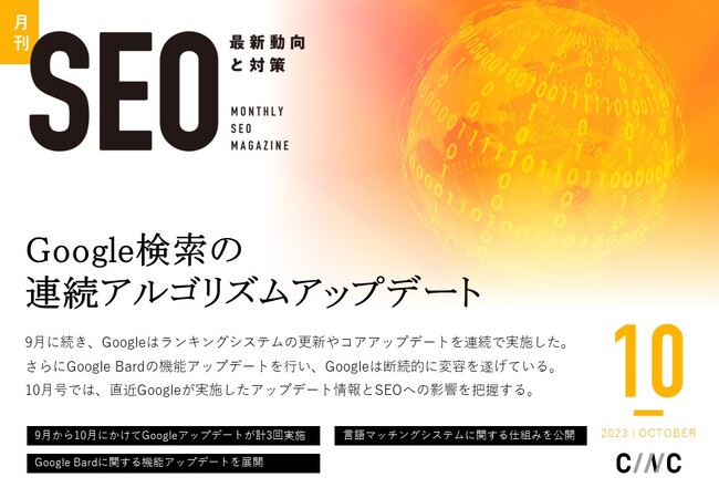 株式会社CINC(東京都港区 代表取締役社長 石松友典、以下 CINC)は、毎月特定のテーマのSEO最新動向と対策についてレポートする「月刊SEO」の10月号を公開しました。