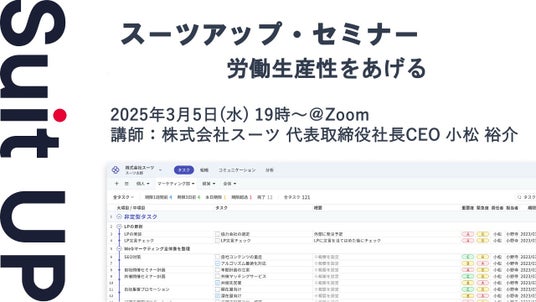 株式会社スーツ(所在地:東京都千代田区、代表取締役社長CEO:小松 裕介)は、2025年3月5日(水)19時から、当社代表の小松が講師を務めるスーツアップ・セミナー「労働生産性をあげる」を無料開催します。