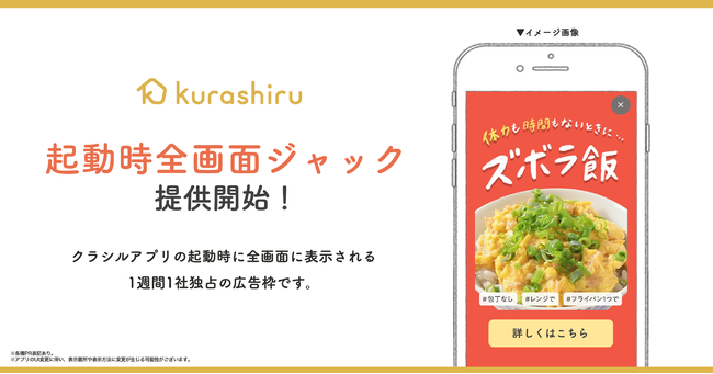 国内No.1のレシピ動画プラットフォーム「クラシル」(※1)は、8月19日(金)より、新たな広告プランとして「起動時全画面ジャック」の提供を開始します。「起動時全画面ジャック」はクラシルアプリ起動時に全画面で表示されるため、ユーザーの印象に残りやすく、商品認知やブランディング・第一想起を形成することが可能になります。
