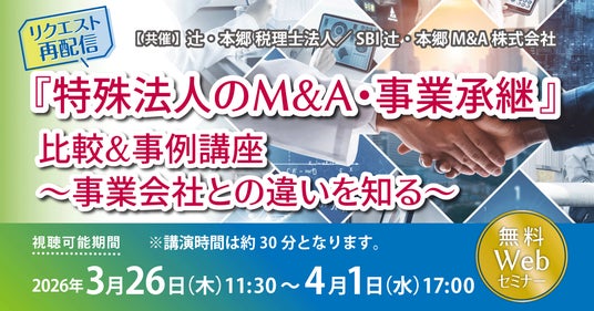 辻・本郷 税理士法人(本社:東京都新宿区、理事長:桑木小恵子)は、SBI 辻・本郷M&A株式会社(本社:東京都千代田区、代表取締役:小林堅悟)と共催で、2026年3月26日(木)より、Webセミナー「【リクエスト再配信】特殊法人のM&A・事業承継 比較&事例講座」を開催いたします。