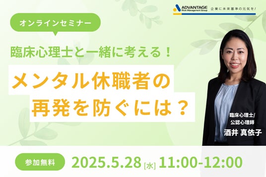 株式会社アドバンテッジリスクマネジメントは、2025年5月28日(水)に人事・労務・メンタルヘルス対策ご担当者様、健康経営部門のご担当者様を対象としたWebセミナー「臨床心理士と一緒に考える!