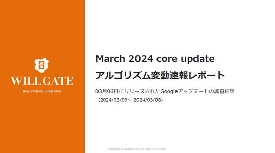 株式会社ウィルゲート(本社:東京都港区、代表取締役:小島 梨揮、以下「ウィルゲート」)は、2024年3月6日(水)にGoogleからリリースされたアルゴリズムアップデート(March 2024 core update)の情報をレポートにまとめ、無料公開しました。このレポートは自社サイトのSEO状況に影響を感じている方に向けた調査レポートになります。