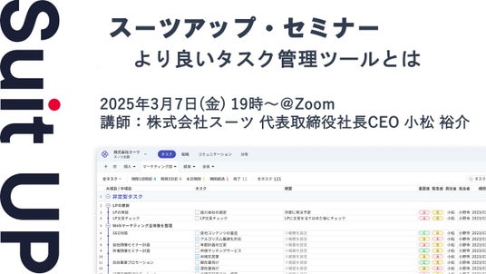 株式会社スーツ(所在地:東京都千代田区、代表取締役社長CEO:小松 裕介)は、2025年3月7日(金)19時から、当社代表の小松が講師を務めるスーツアップ・セミナー「より良いタスク管理ツールとは」を無料開催します。