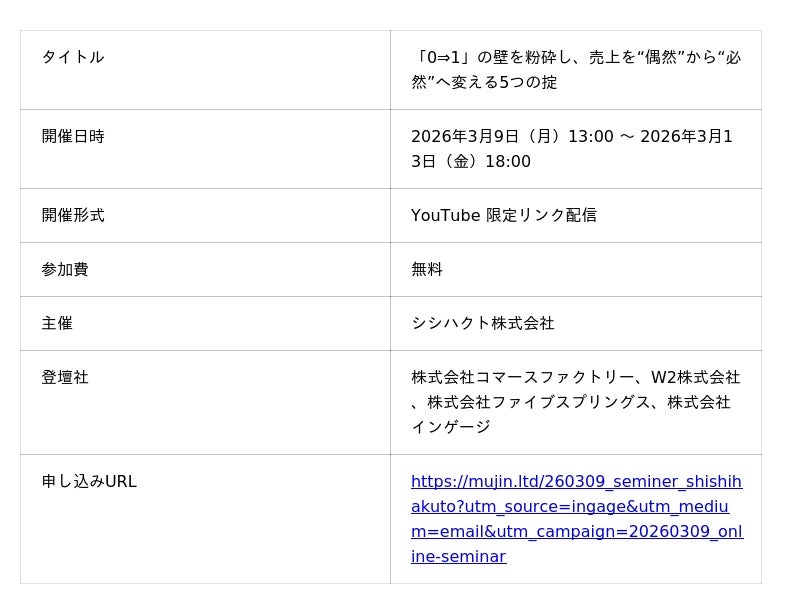 コミュニケーションプラットフォーム「Re:lation(リレーション)」を提供し、6,000社以上(※1)の導入実績を誇る株式会社インゲージ(本社:大阪府大阪市、代表取締役社長:和田 哲也)は、2026年3月9日(月)より、シシハクト株式会社主催のオンラインカンファレンス『「0⇒1」の壁を粉砕し、売上を“偶然”から“必然”へ変える5つの掟』に登壇することをお知らせいたします。