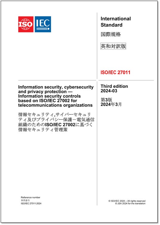 ご注文はこちらISO/IEC 27011:2024情報セキュリティ,サイバーセキュリティ及びプライバシー保護-電気通信組織のためのISO/IEC 27002に基づく情報セキュリティ管理策Information security, cybersecurity and privacy protection -- Information security controls based on ISO/IEC 27002 for telecommunications organizations