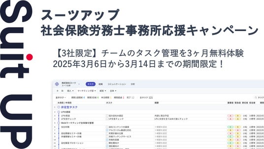 株式会社スーツ(所在地:東京都千代田区、代表取締役社長CEO:小松 裕介)は、チームでかんたん、毎日続けられるプロジェクト・タスク管理ツールの経営支援クラウド「Suit UP」(スーツアップ)において、社会保険労務士事務所応援キャンペーンを実施いたします。