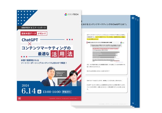 ファクトに基づいたコンテンツ開発とマーケティング支援を行う、株式会社IDEATECH(本社:東京都港区、代表取締役社長:石川友夫、以下 IDEATECH)が開催した「最新米国データが明かす|ChatGPT×コンテンツマーケティングの最適な活用法~米国で重要視されるソートリーダーシップコンテンツも合わせて解説!~」と題するオンラインセミナーは、日本と米国のBtoB企業の広告施策の実態、今後BtoB企業が検討すべきマーケティング施策の紹介により、参加者の新たな視点に繋がる有意義なイベントとなりました。 このたび、セミナーの全容をまとめたレポートを公開しましたので、お知らせいたします。