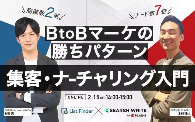株式会社イノベーション(東証グロース 証券コード3970)のグループ会社である、株式会社Innovation & Co.(本社:東京都渋谷区、代表取締役社長:齊藤和馬、以下「Innovation & Co.」)は、デジタルマーケティングやメディア事業を展開する株式会社PLAN-B(東京本社:東京都品川区、代表取締役:鳥居本 真徳氏、以下PLAN-B社)と共催で、「リード数7倍、商談数2倍! BtoBマーケの勝ちパターン【集客・ナーチャリング入門】」をテーマとしたセミナーを2023年2月15日(水)に開催いたします。