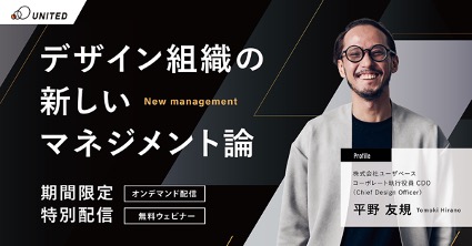 ユナイテッド株式会社(本社:東京都渋谷区、代表取締役社長 兼 執行役員:早川 与規、証券コード:2497、以下:ユナイテッド)は、2022年7月に開催したウェビナー「【ユーザベースのコーポレート執行役員CDOが語る】デザイン組織の新しいマネジメント論」を期間限定で再配信することをお知らせいたします。配信期間は2023年2月10日(金)11:00~2月19日(日)23:00までです。人材マッチング事業などを展開するユナイテッドは、ウェビナーの開催や配信を通して、多くの採用・人材育成課題の解決に貢献してまいります。