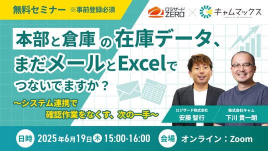 クラウド型在庫管理システムのリーディングカンパニーであるロジザード株式会社(東京都中央区、代表取締役社長:金澤 茂則、以下:ロジザード)は、株式会社キャム(福岡県福岡市中央区、代代表取締役CEO:下川 良彦、以下:キャム)と共催ウェビナー『本部と倉庫の在庫データ、まだメールとExcelでつないでますか?~システム連携で確認作業をなくす、次の一手~』を2025年6月19日(木)15:00~16:00に開催決定、申し込み受付を開始しました。