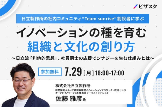 株式会社ビザスク~株式会社日立製作所において、社内イノベーションネットワーク「Team sunrise」を立ち上げた佐藤 雅彦氏がご登壇!~