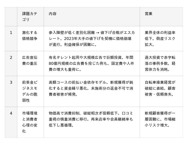 相次ぐ経営破たんの背景には、業界が抱える構造的な課題の存在が指摘されています。主な問題点は次の表の通りです。