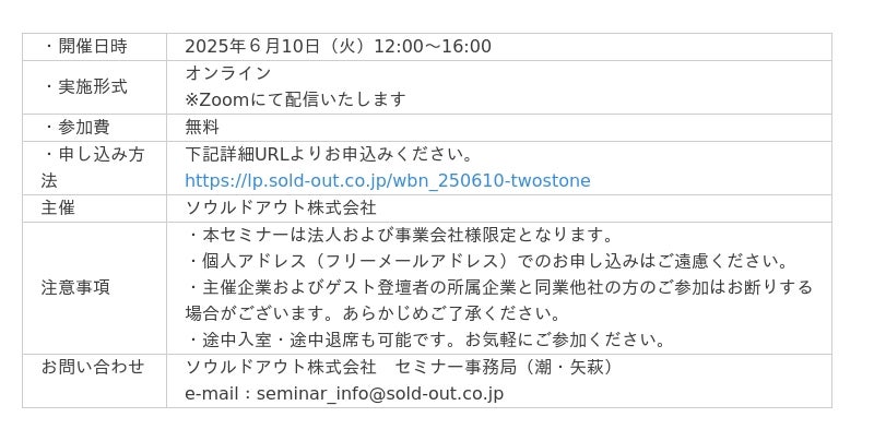 株式会社TWOSTONE&Sonsの100%子会社である株式会社Digital Arrow Partners(所在地:東京都渋谷区、代表取締役CEO:道家康貴、以下 Digital Arrow Partners)は、2025年6月10日(火)にソウルドアウト株式会社(本社:東京都文京区、代表取締役社長CEO兼CCO:荒波修、以下 ソウルドアウト)が開催するオンラインカンファレンスに登壇することをお知らせいたします。