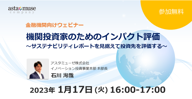 アスタミューゼ株式会社(本社:東京都千代田区、代表取締役社長 永井歩)は、「機関投資家のためのインパクト評価 ~サステナビリティレポートを見据えて投資先を評価する~」と題し、無料ウェビナーを開催いたします。