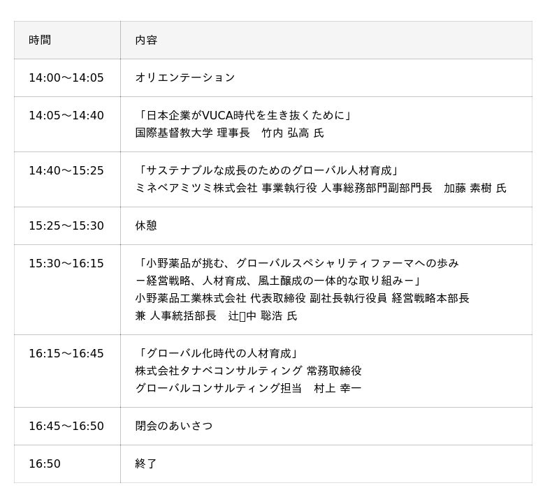 本フォーラムでは、ハーバード・ビジネス・スクールで長年教鞭を執られた国際基督教大学 理事長 竹内 弘高 氏を基調講演にお迎えし、世界標準の人材育成手法やグローバルな視点で求められるリーダーシップについてお話しいただきます。また、グローバル展開やグローバル人材育成を推進する先進企業として、ミネベアミツミ株式会社 事業執行役 人事総務部門副部門長 加藤 素樹 氏、小野薬品工業株式会社 代表取締役 副社長執行役員 経営戦略本部長 兼 人事統括部長 辻中 聡浩 氏にご登壇いただき、具体的な取り組みを通じて、実践的な人材育成のアプローチをご紹介します。さらに、株式会社タナベコンサルティング 常務取締役 グローバルコンサルティング担当 村上 幸一が「グローバル化時代における人材育成のポイント」を解説いたします。