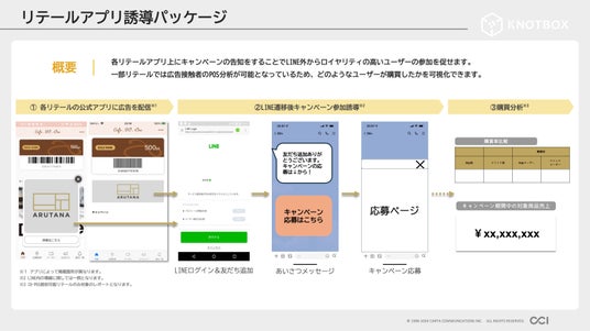 今回、このKNOTBOXが持つマストバイキャンペーン機能と、ARUTANAが提供するアドネットワーク広告を連携させ、集客からキャンペーン、インセンティブ付与まで一気通貫で対応できる販促パッケージ商品を作成いたしました。