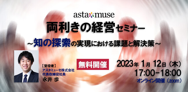 アスタミューゼ株式会社(本社:東京都千代田区、代表取締役社長 永井歩)は、2023年1月12日(木)17:00-18:00に、知財・R&D・新規事業担当者向けの無料ウェビナー「両利きの経営セミナー ~知の探索の実現における課題と解決策~」を開催いたします。昨年11月14日に開催し、ご好評いただいたウェビナーの内容を一部アップデートした再講演となります。