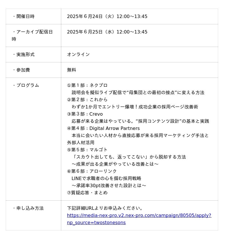株式会社TWOSTONE&Sonsの100%子会社である株式会社Digital Arrow Partners(所在地:東京都渋谷区、代表取締役CEO:道家康貴、以下 Digital Arrow Partners)は、2025年6月24日(火)に株式会社ネクプロ(本社:東京都千代田区、代表取締役:尾花慎也、以下 ネクプロ)、株式会社これから(本社:東京都新宿区、代表取締役:今泉雄介、以下 これから)、Crevo株式会社(本社:東京都港区、代表取締役社長:水口仁志、以下 Crevo)、マルゴト株式会社(本社:北海道札幌市、代表取締役:今啓亮、以下 マルゴト)、株式会社アローリンク(本社:兵庫県神戸市、代表取締役:蓬莱和真、以下 アローリンク)と6社共催でセミナーを開催することをお知らせいたします。